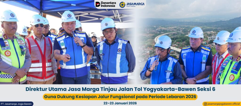 Kunjungan Direktur Utama Jasa Marga Tinjau Kesiapan Jalur Fungsional Seksi 6 Ambarawa–Bawen Jelang Lebaran 2026 11/02/2026 Berita Baca Selengkapnya Kasultanan Dukung Penggunaan Tanah Kasultanan untuk Proyek Pembangunan Jalan Tol Ruas Yogyakarta-Bawen di Wilayah Daerah Istimewa Yogyakarta. 27/01/2026 Berita Baca Selengkapnya PT JJB Salurkan Program TJSL 2025 untuk Dukung Peningkatan Kualitas Pendidikan di SDN Kalurahan Bawen 05/01/2026 Berita Baca Selengkapnya PT Jasamarga Jogja Bawen (PT JJB) bersama PT Penjaminan Infrastruktur Indonesia (PT PII) melaksanakan kegiatan penanaman 1.500 bibit pohon di Dusun Plataran, Kalurahan Banyurejo 28/11/2025 Berita Baca Selengkapnya Dirgahayu Jasamarga Jogja Bawen Ke-5 27/11/2025 Berita Baca Selengkapnya PENGUMUMAN PENGADAAN JASA KONSTRUKSI BANGUNAN PENGGANTI 03/10/2025 Pengumuman Baca Selengkapnya PT Jasamarga Jogja Bawen Jalin Kerja Sama dengan Fakultas Psikologi UGM untuk Perkuat Layanan Kesehatan Mental Karyawan 22/08/2025 Berita Baca Selengkapnya PT Jasamarga Jogja Bawen Tandatangani Perjanjian dengan Kraton Yogyakarta Terkait Penggunaan Tanah Kasultanan untuk Jalan Tol 14/07/2025 Berita Baca Selengkapnya PT Jasamarga Jogja Bawen Gelar Sosialisasi Penanaman Pohon di Kelurahan Banyurejo, Sleman 26/06/2025 Berita Baca Selengkapnya Dorong Literasi Finansial di Kalangan Karyawan, PT Jasamarga Jogja Bawen Gelar Sharing Session Pengelolaan Investasi di Pasar Modal 26/06/2025 Berita Baca Selengkapnya
