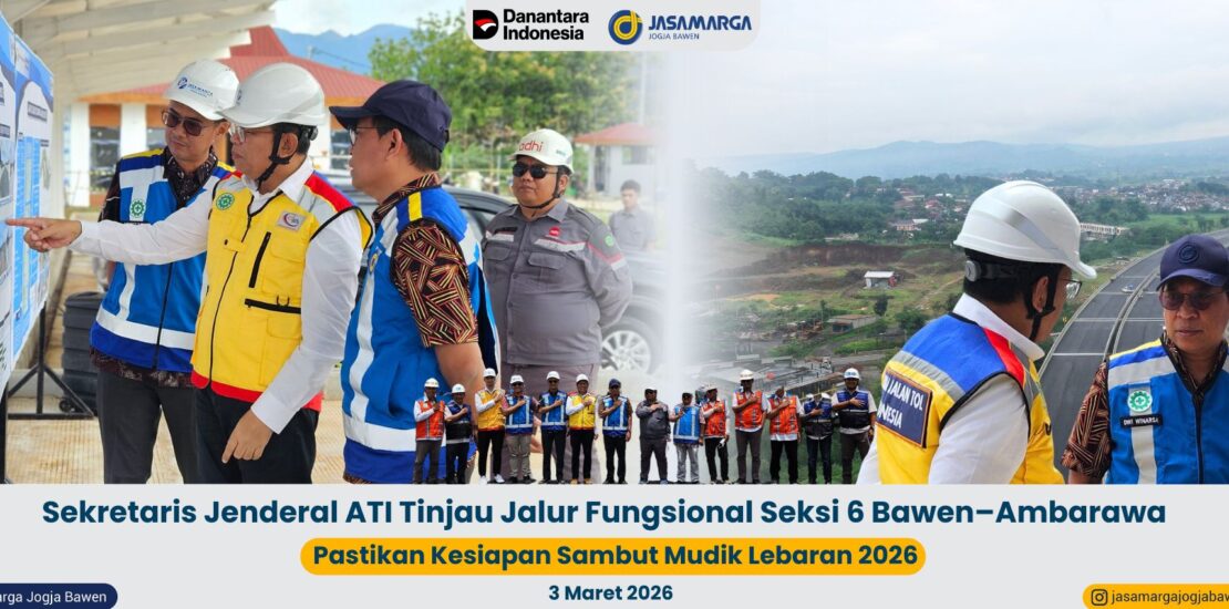 PT Jasamarga Jogja Bawen (PT JJB) menerima kunjungan Sekretaris Jenderal Asosiasi Jalan Tol Indonesia (ATI), Kris Ade Sudiyono bersama tim pada Selasa, 3 Maret 2026 di Seksi 6 Bawen–Ambarawa. Kunjungan ini menjadi bagian dari upaya koordinasi dan peninjauan lapangan terhadap kesiapan jalur fungsional yang tengah dipersiapkan untuk mendukung kelancaran arus mudik dan arus balik Idul Fitri 1447 H.